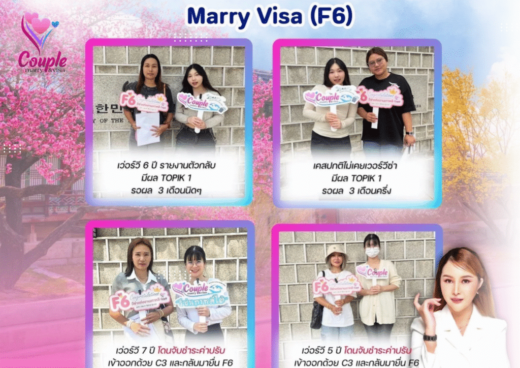 ข้อควรระวัง การพิจารณาวีซ่า F-6 จะดูไปถึงความสัมพันธ์ของคู่รัก, ความมั่นคงทางการเงินและที่อยู่อาศัยของฝ่ายเกาหลีอย่างละเอียด การให้ข้อมูลที่ไม่สอดคล้องกันหรือเอกสารที่ไม่น่าเชื่อถือ อาจทำให้วีซ่าถูกปฏิเสธได้ Couplemarryvisa มีความเชี่ยวชาญด้านวีซ่าแต่งงานโดยเฉพาะ เราพร้อมให้คำปรึกษาและดูแลเคสของคุณตั้งแต่เริ่มต้นจนได้รับวีซ่า